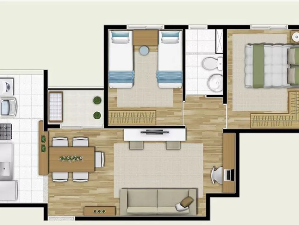 - Piso de carpete de madeira na sala e nos dois quartos